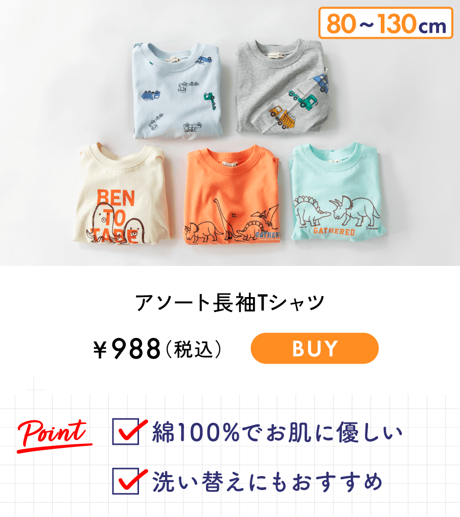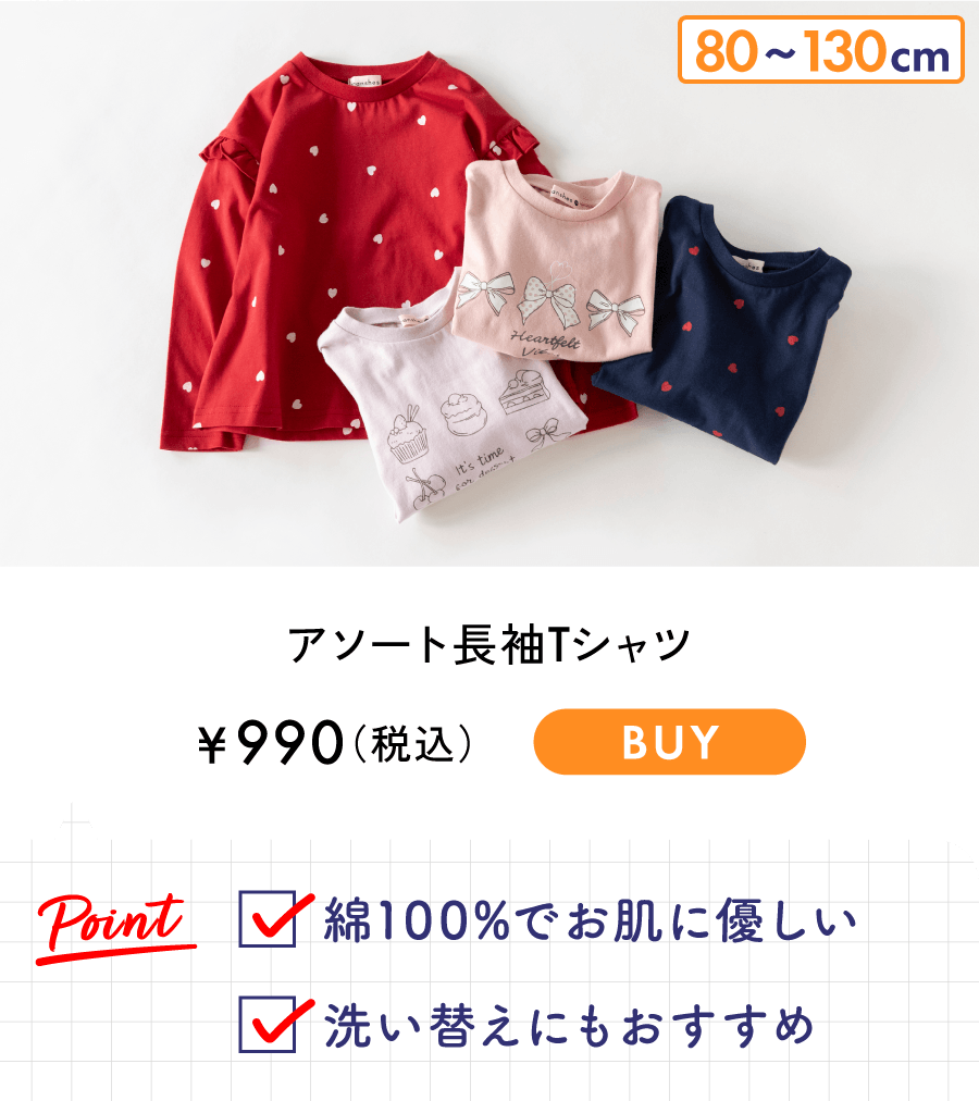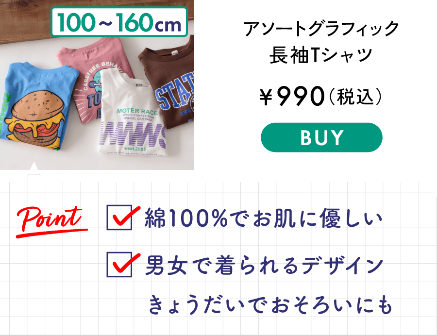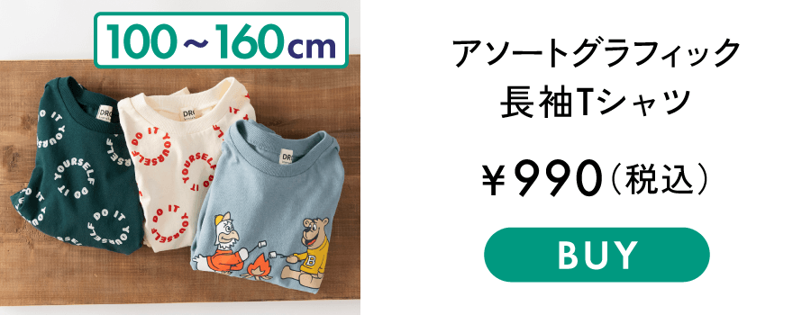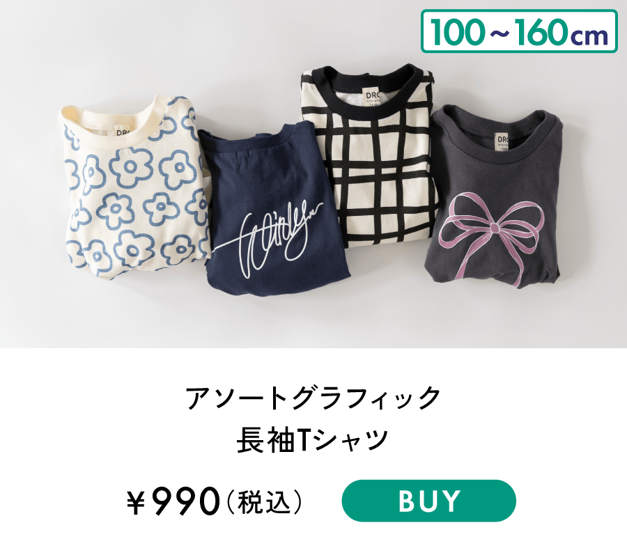 ■商品ポイント■<br>お気に入りの1枚がきっと見つかる♪<br>カラバリ・柄バリ豊富な綿100%長袖Tシャツ<br>袖口がリブ仕様なので腕まくりした際に<br>きゅっと止まるのも普段使いには嬉しいポイント!<br>兄弟姉妹、友達同士でのお揃いコーデにもおすすめです<br>あって嬉しい♪お名前ネーム付き<br><br>■素材■<br>本体部分:綿100%生地(天竺)を使用<br>吸水性が高く通気性が良いのが特徴<br>肌触りが良くお子様の肌にも安心です<br><br><br>■DRCbranshesとは?■<br>Daily…毎日<br>Relax…力を抜いて、くつろぐ<br>Comfortable…気持ちの良い、快適な<br>着心地の良い服を、手に取りやすい価格で。<br>『毎日着て欲しい』<br>そんな思いを込めてブランシェスから<br>デイリーウェアをご提案する新レーベルです<br><br>-----<br>伸縮性:あり<br>透け感:03:ドーナツ_OW/ややあり<br> 91:ありがとう_IV/ややあり<br> その他カラー/なし<br><br>#drc#おとこのこ#おんなのこ#ボーイズ#ガールズ<br>#通園コーデ#通学コーデ#小学生コーデ<br>#プチプラ#プチプラ子供服#子供服通販<br>#お揃い#お揃いコーデ<br>#ペア#ペアコーデ<br>#リンク#リンクコーデ<br>#ユニセックス#160cm<br><br>着用イメージ/カラー:78 :リボン_CGY<br>モデル:身長108.0cm 体重18kg<br>サイズ:サイズ110 | 在庫がありません | ||