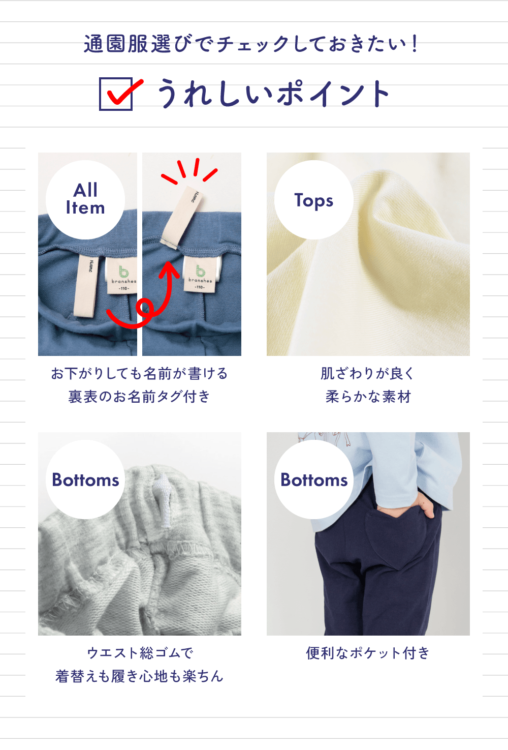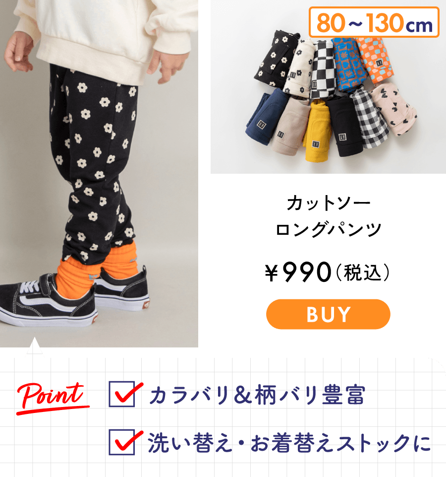 さらに伸びる!!ストレッチ生地にリニューアル<br><br>■商品ポイント■<br>お気に入りの1枚がきっと見つかる♪<br>カラバリ・柄バリ豊富なカットロングパンツは<br>通園通学シーンにピッタリなアイテムです<br>洗い替えや保育園のお着替えストックに最適♪<br>ハンカチやミニタオルを入れるポケット付き<br>ポケットにはオリジナルネームが付いています♪<br>性別問わずお使いいただけるので<br>兄弟姉妹、友達同士でのお揃いコーデにもおすすめです<br>あって嬉しい♪お名前ネーム付き<br><br>ゆったりサイズはこちら<br>16-5342-324 <br>【WEB限定/DRC】カットソーロングパンツ ゆったりサイズ<br><br>■素材■<br>縦横しっかりとストレッチの効かせたストレッチインレイ生地<br>程よい厚みで季節問わずお使いいただけます<br><br>■DRCbranshesとは?■<br>Daily…毎日<br>Relax…力を抜いて、くつろぐ<br>Comfortable…気持ちの良い、快適な<br>着心地の良い服を、手に取りやすい価格で。<br>『毎日着て欲しい』<br>そんな思いを込めてブランシェスから<br>デイリーウェアをご提案する新レーベルです<br><br>-----<br>伸縮性:あり<br>透け感:なし<br>ポケット:後身頃にポケットあり<br><br>#drc#おとこのこ#おんなのこ#ボーイズ#ガールズ<br>#通園コーデ#通学コーデ#小学生コーデ<br>#プチプラ#プチプラ子供服#子供服通販<br>#お揃い#お揃いコーデ<br>#ペア#ペアコーデ<br>#リンク#リンクコーデ<br>#ユニセックス<br>#90cm#100cm#110cm#120cm#130cm<br><br>着用イメージ/カラー:91:ブラック_花柄<br>モデル:身長107.0cm 体重16.5kg<br>サイズ:サイズ110 | 在庫がありません | ||