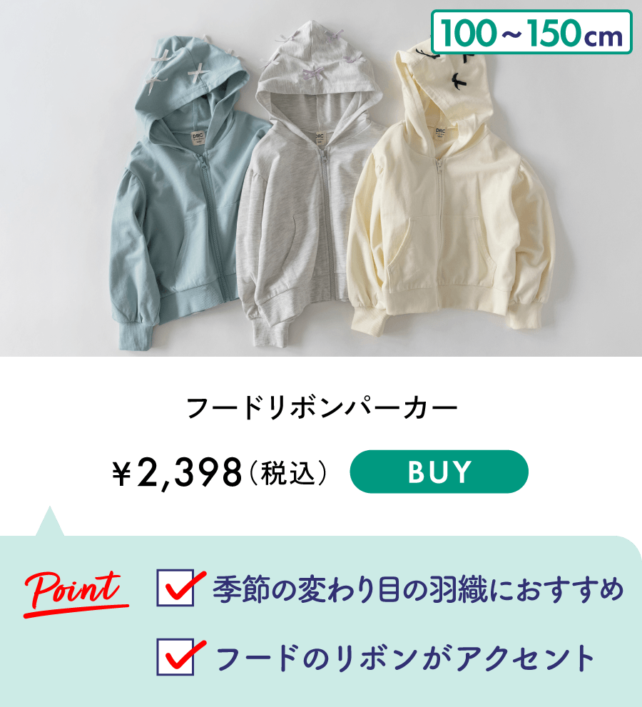 ■商品ポイント■<br>フードにたくさんリボンが付いたパーカーは<br>ボリュームのある袖と少し短めの丈感でショートパンツや<br>スカートとの相性抜群<br>季節の変わり目の肌寒い朝晩やクーラー対策にさっと羽織れる<br>1枚です♪<br>あって嬉しい♪お名前ネーム付き<br><br><br>■素材■<br>縦横しっかりとストレッチの効かせたストレッチインレイ生地<br>程よい厚みで季節問わずお使いいただけます<br><br>■DRCbranshesとは?■<br>Daily…毎日<br>Relax…力を抜いて、くつろぐ<br>Comfortable…気持ちの良い、快適な<br>着心地の良い服を、手に取りやすい価格で。<br>『毎日着て欲しい』<br>そんな思いを込めてブランシェスから<br>デイリーウェアをご提案する新レーベルです<br><br>-----<br>透け感:なし <br>伸縮性:あり<br>ポケット:あり<br><br>#drc#おとこのこ#おんなのこ#ボーイズ#ガールズ<br>#通園コーデ#通学コーデ#小学生コーデ<br>#プチプラ#プチプラ子供服#子供服通販<br>#お揃い#お揃いコーデ<br>#ペア#ペアコーデ<br>#リンク#リンクコーデ<br>#ユニセックス<br>#100cm#110cm#120cm#130cm#140cm#150cm<br><br>着用イメージ/カラー:アイボリー<br>モデル:身長107.0cm 体重16.5kg<br>サイズ:サイズ110 | 在庫がありません |
