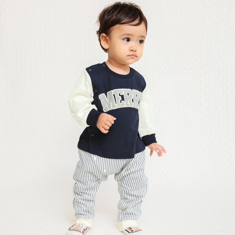 長袖Tシャツとストライプパンツを重ね着したデザインの