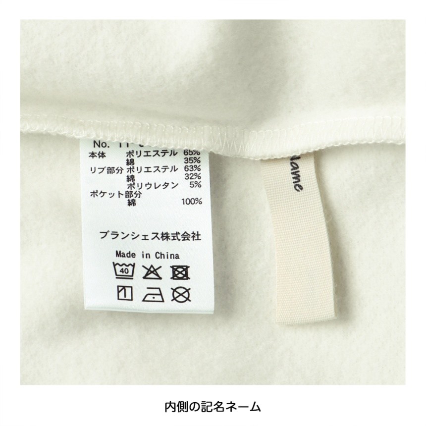 - 本体:ポリエステル65% 綿35% リブ部分:ポリエステル63% 綿32% ポリウレタン5% ポケット部分:綿100%