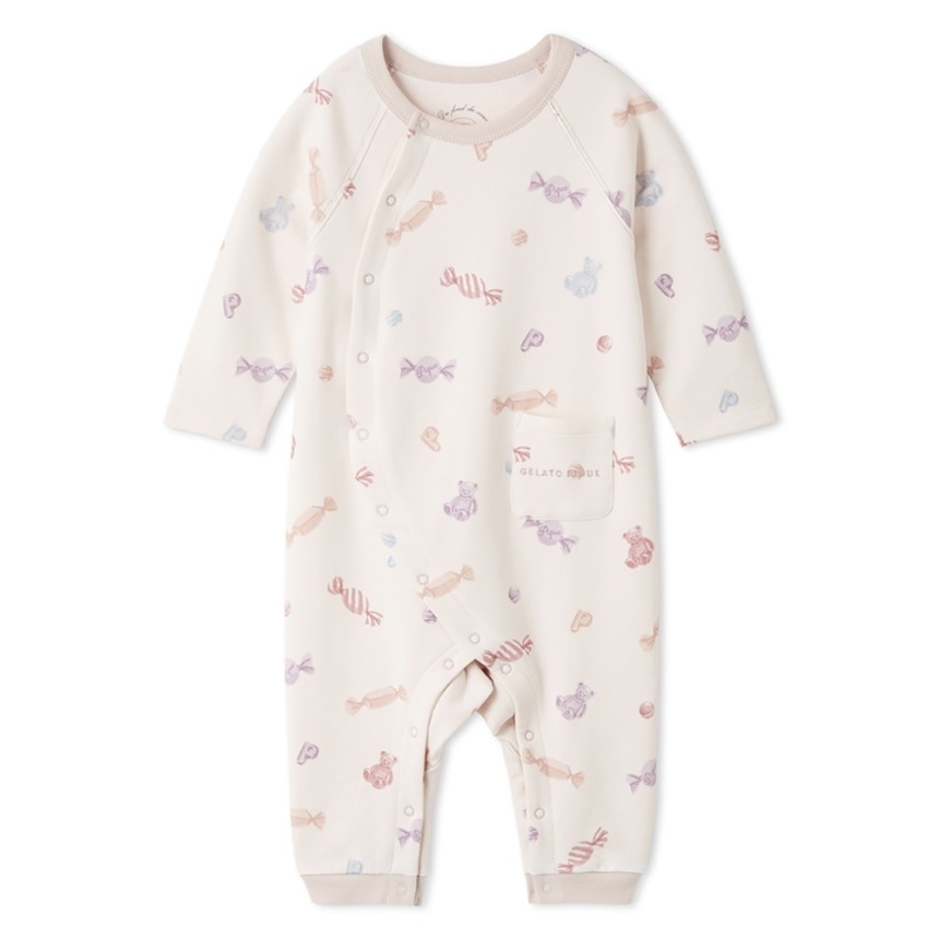 gelato piqueらしいベアやロゴモチーフのカラフルなキャンディを散りばめた、HAPPYな総柄プリントのBABYロンパースです。程良くふっくらとしたコットン混のインレイ素材を使用し、ゆったりとしたラグランスリーブで動きやすく仕上げました。首元と足首の配色デザインと、フロントポケットに入れた刺繍がポイントです。