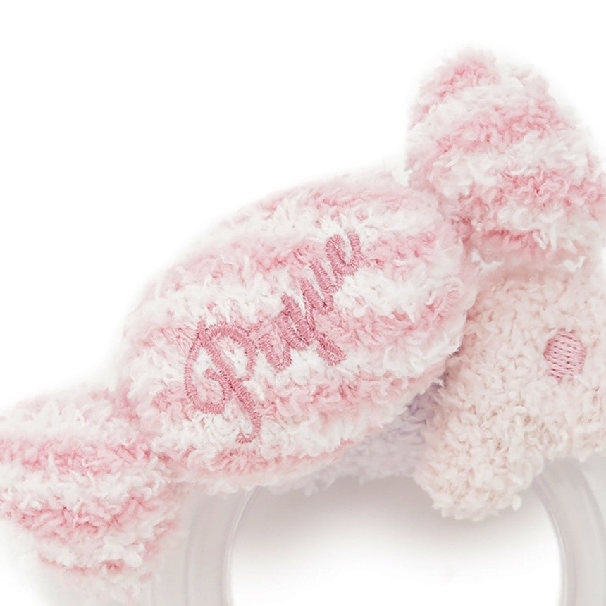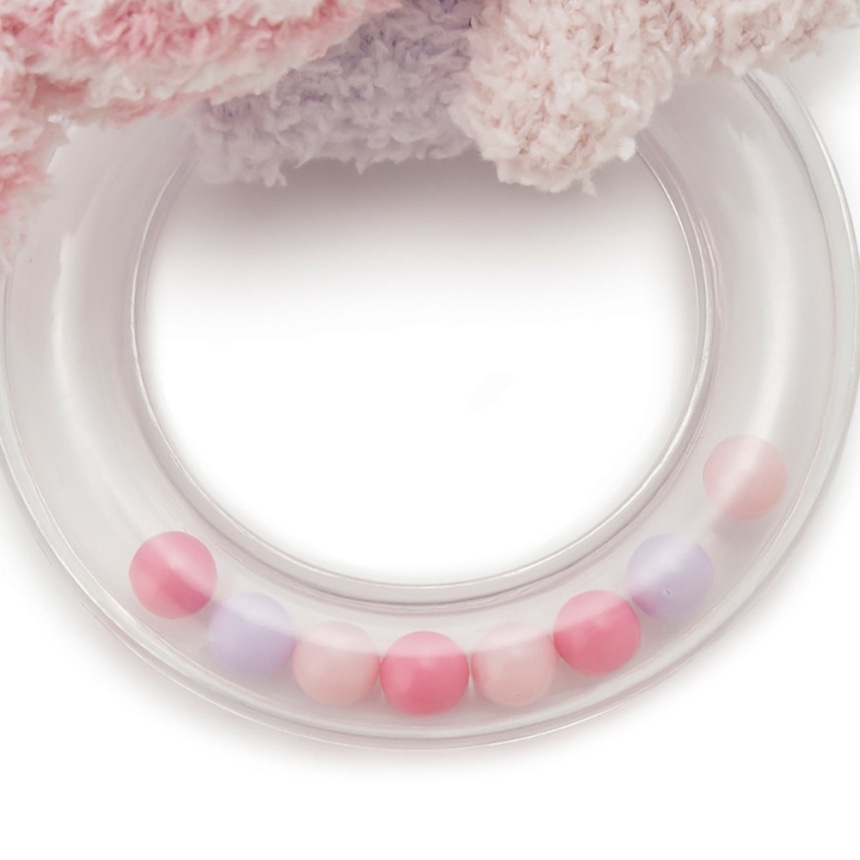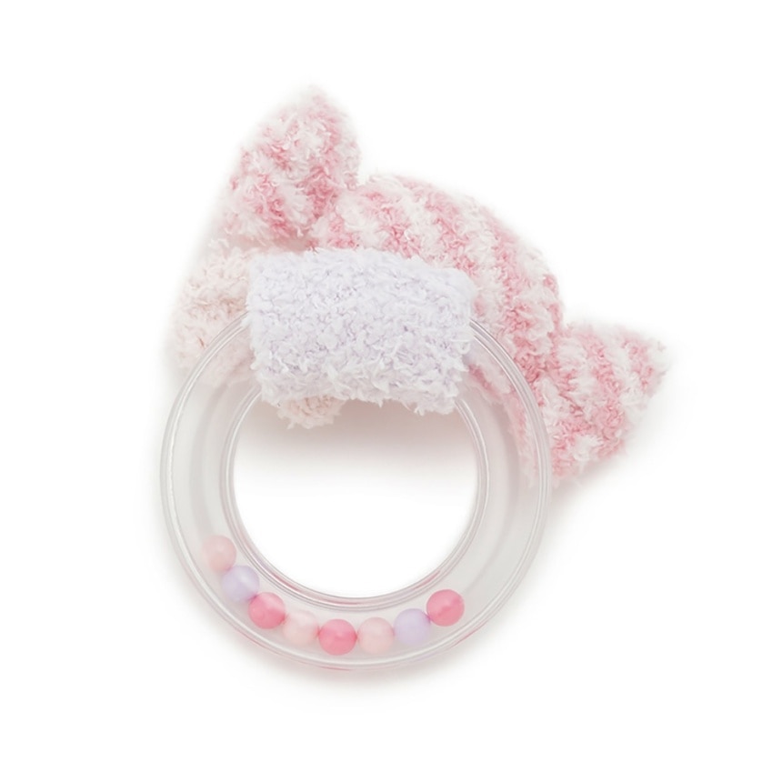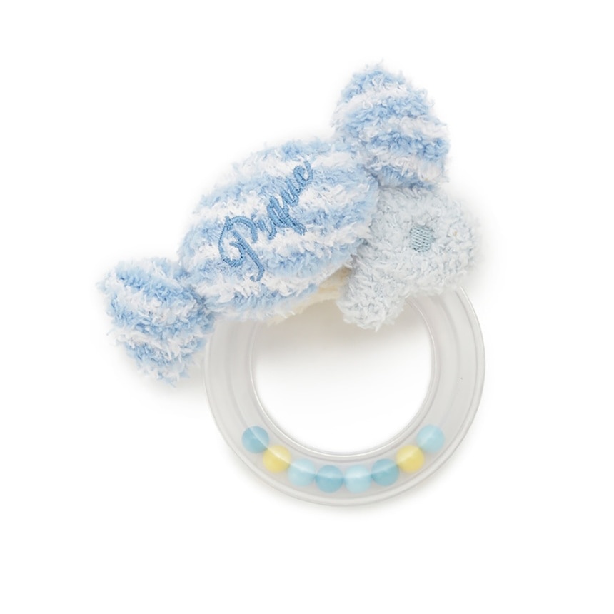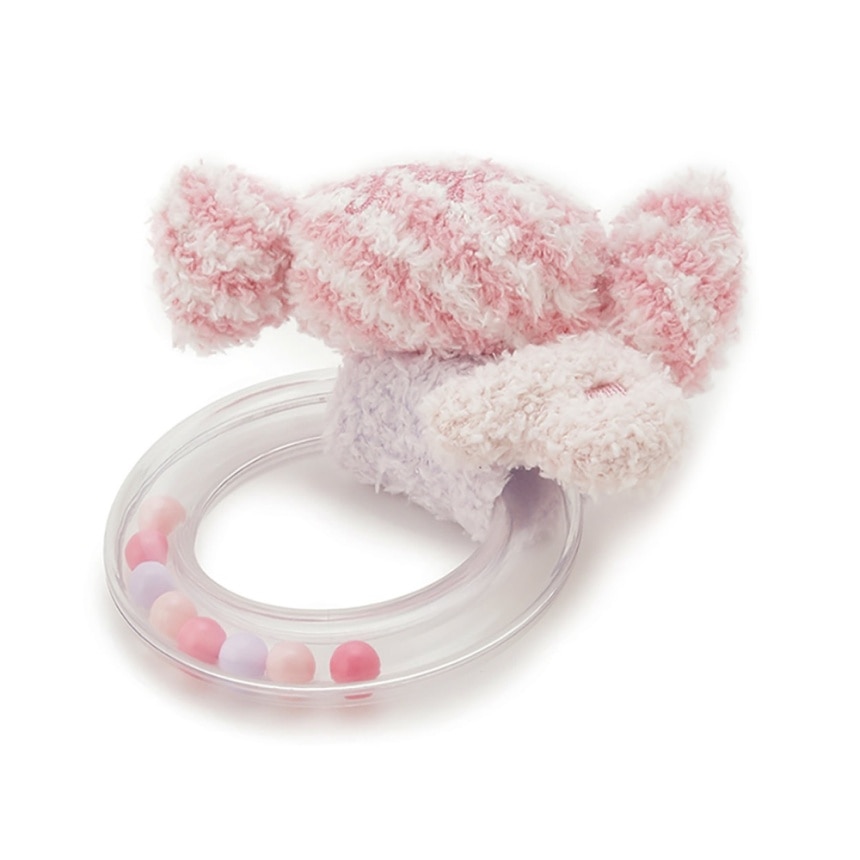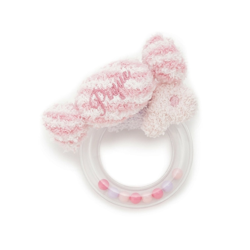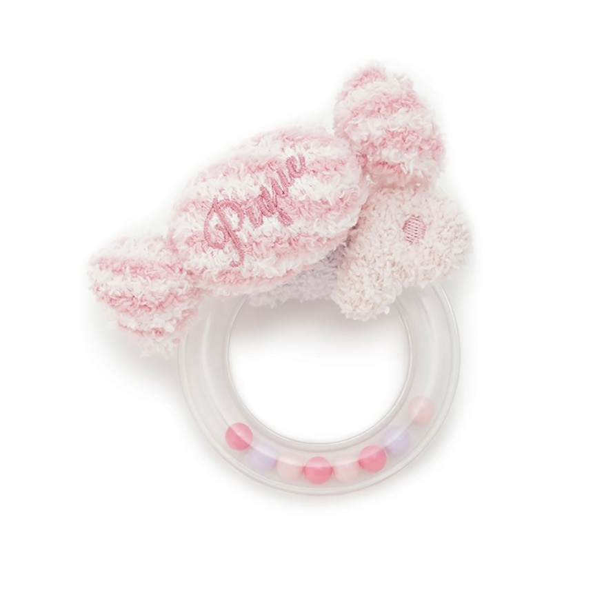 キュートなキャンディをモチーフにした、’ベビモコ’素材のBABYシリーズ。カラフルなビーズが入った透明の輪っかに、ふわふわのキャンディをあしらったBABYラトルです。ビーズの動きや、キャンディを握ったときの音や感触など、色々な仕掛けが赤ちゃんの関心を引き寄せます。