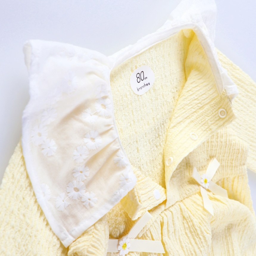 襟にはお花刺しゅうをあしらい、1枚でぐっと華やかな印象のカバーオール