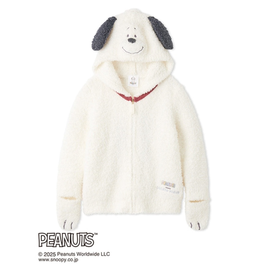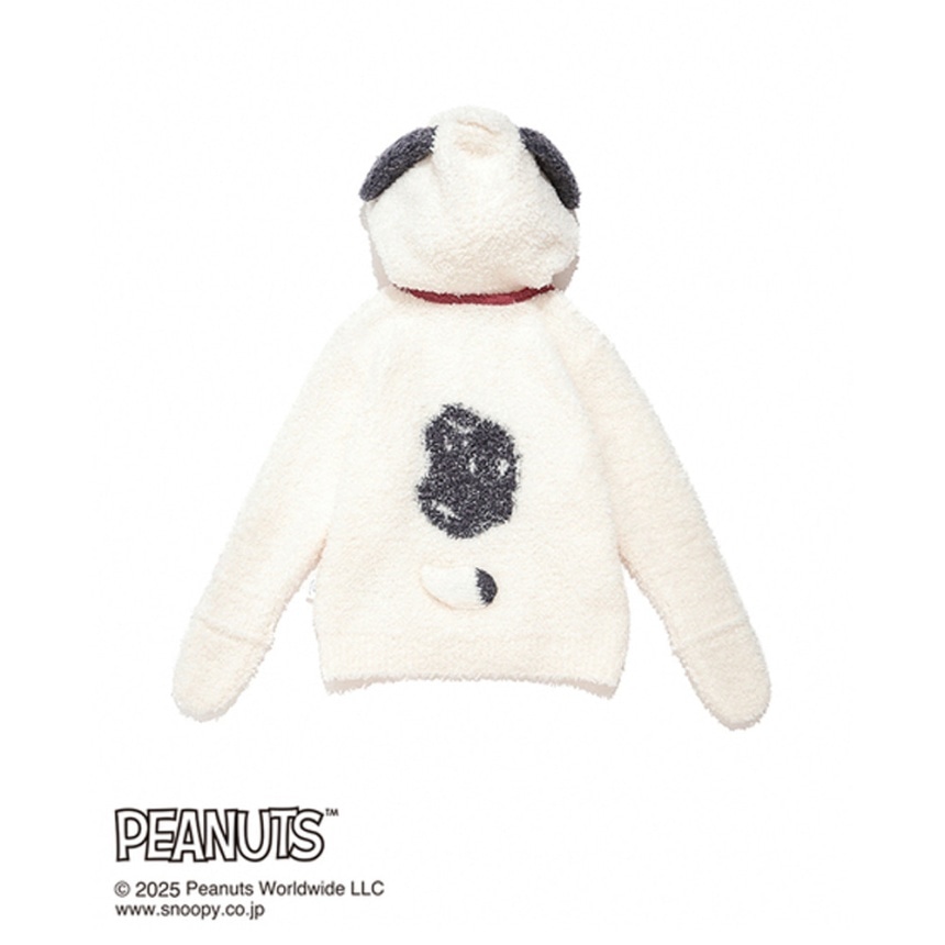 まるでおもちゃ箱から飛び出してきたような、小さくて無邪気な6きょうだい。PEANUTSとgelato piqueのコラボレーションシリーズから、スヌーピーときょうだいたちの子犬時代を描いた『デイジーヒルパピーズ』をモチーフとしたコレクションが生まれました。パピーのようにくるくるっとした糸で編んだ、キッズサイズのふっくらとしたジップパーカ。立体的な耳とマズルが付いたフードには、ニコニコ顔のスヌーピーを描いています。袖口は前足をデザインしたミトンが付いているので、寒い日のちょっとしたお出かけにも重宝。フロントポケットにはカラフルなロゴ刺しゅうも入れました。背中にはジャガードで表現した模様と、立体的な尻尾付きで、後ろ姿も愛らしく演出します。