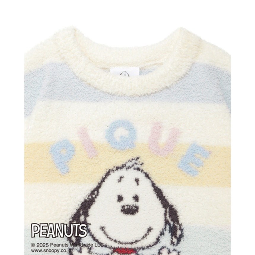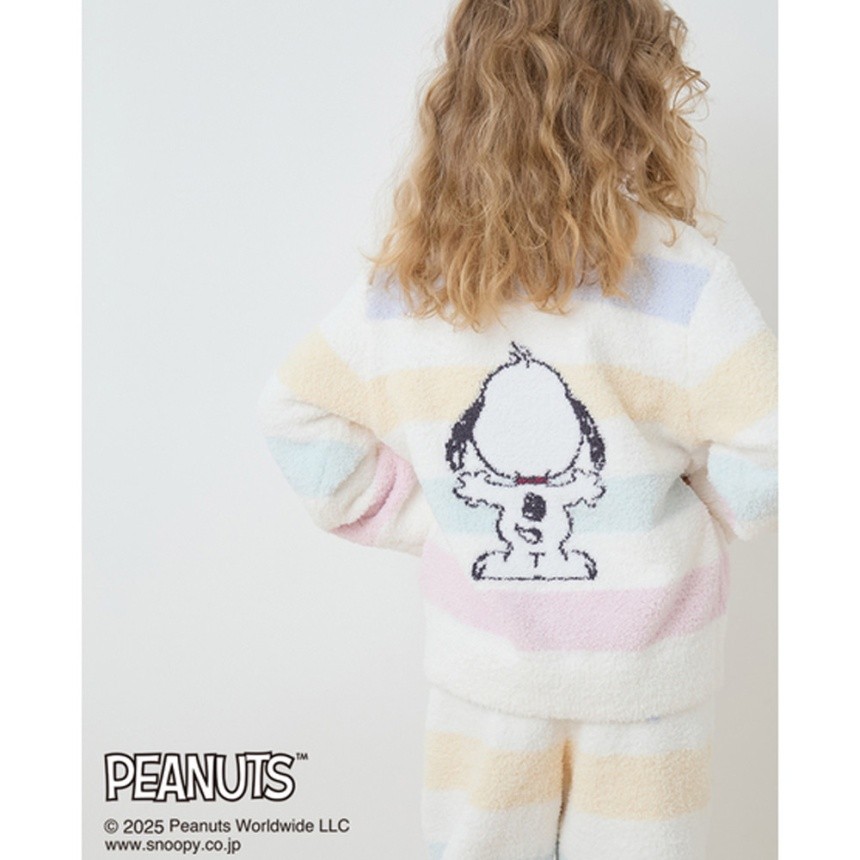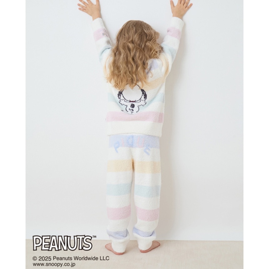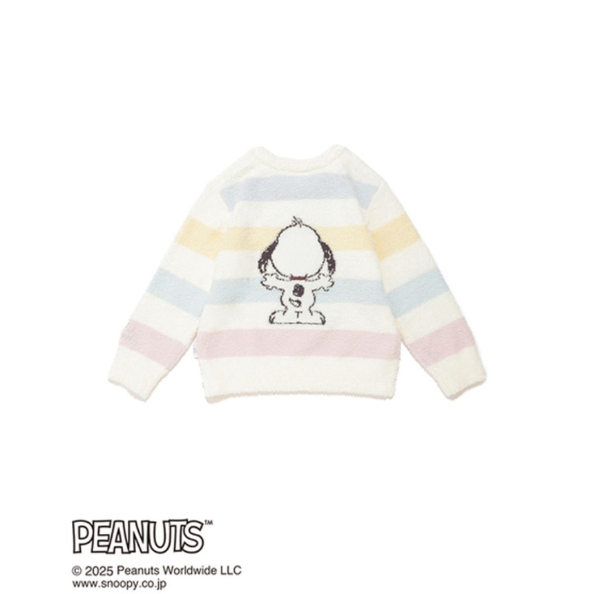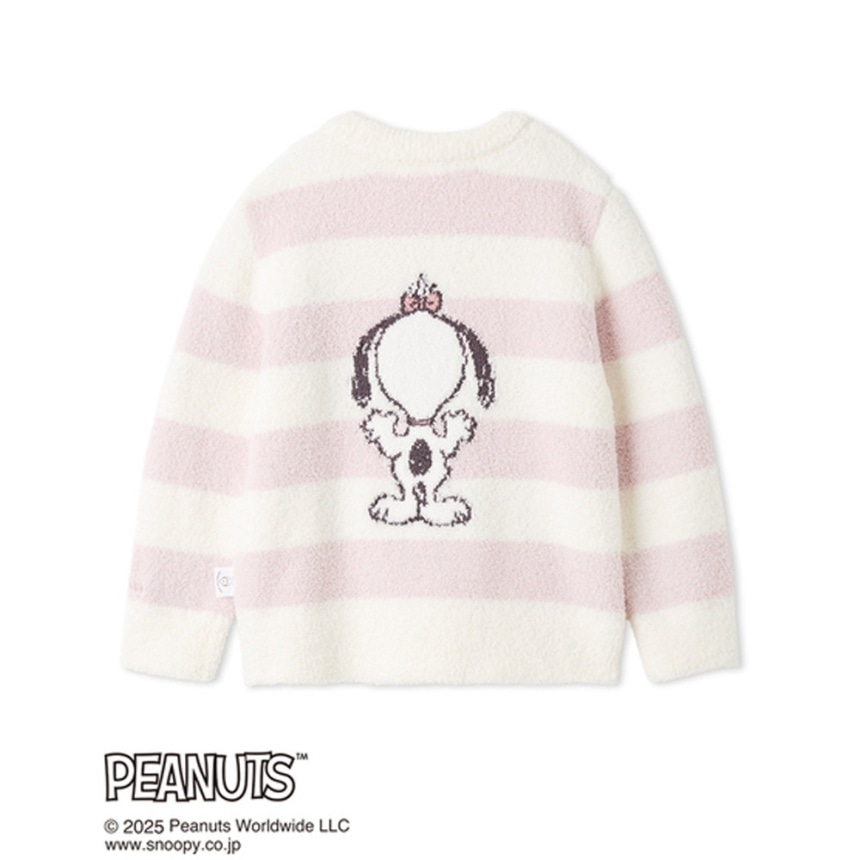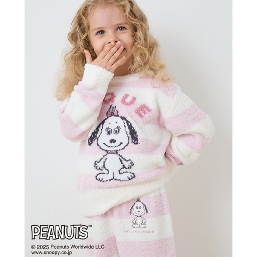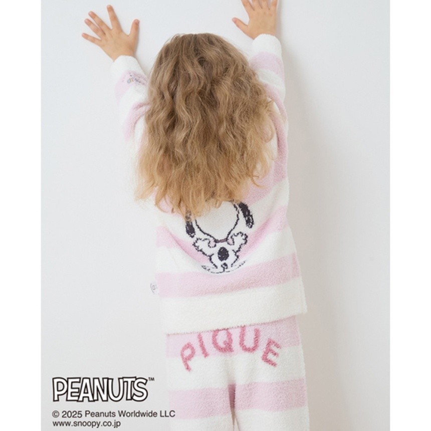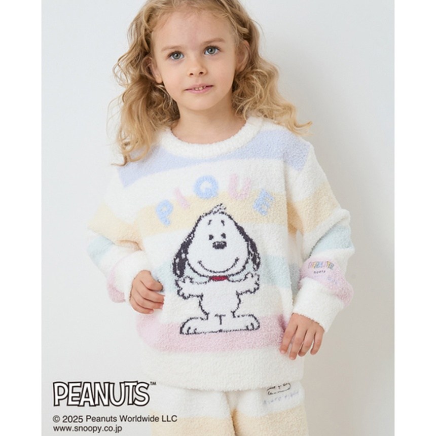 まるでおもちゃ箱から飛び出してきたような、小さくて無邪気な6きょうだい。PEANUTSとgelato piqueのコラボレーションシリーズから、スヌーピーときょうだいたちの子犬時代を描いた『デイジーヒルパピーズ』をモチーフとしたコレクションが生まれました。6きょうだいの中から、スヌーピーとアンディ、ベルの3匹をフィーチャーした定番’ベビモコ’素材のキッズプルオーバー。ボーダー柄をベースに、キャラクターとロゴをジャガードであしらいました。背面にはキャラクターの後ろ姿をデザインし、左袖口にはロゴ刺しゅう入り。ゆったりしたシルエットで優しい着心地です。