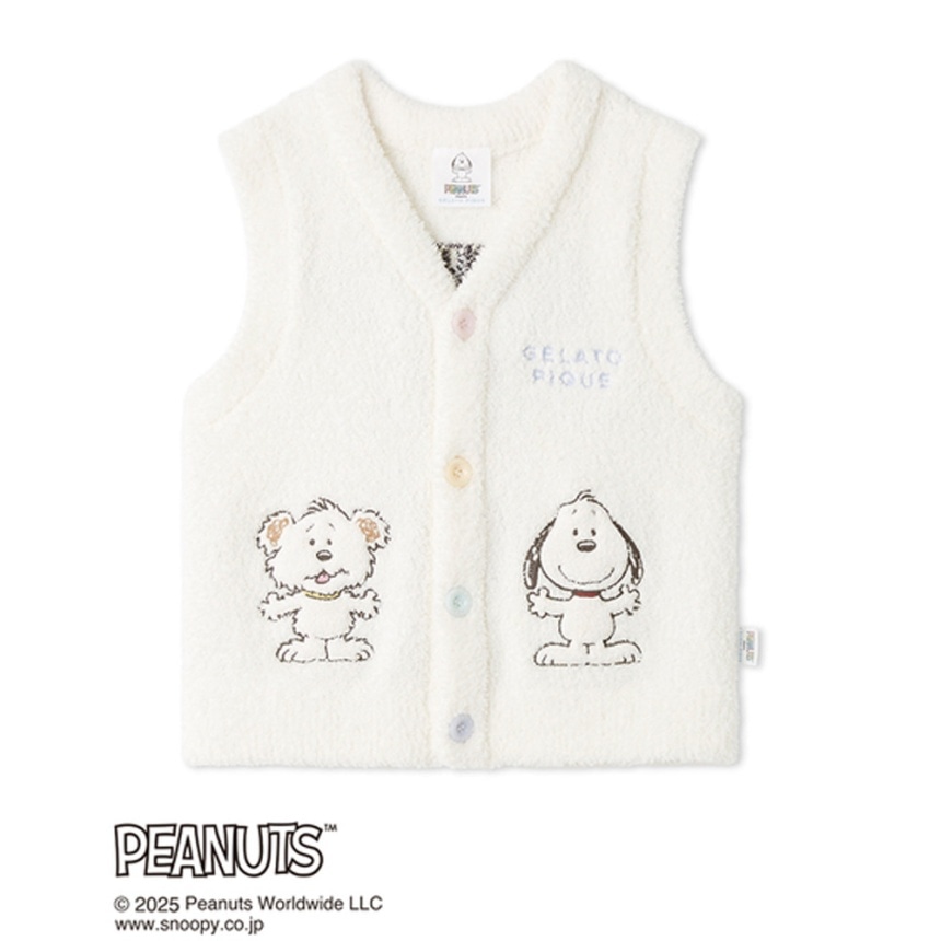 まるでおもちゃ箱から飛び出してきたような、小さくて無邪気な6きょうだい。PEANUTSとgelato piqueのコラボレーションシリーズから、スヌーピーときょうだいたちの子犬時代を描いた『デイジーヒルパピーズ』をモチーフとしたコレクションが生まれました。スヌーピーときょうだいたちの絵柄が大集合した、ふんわり軽い’ベビモコ’素材のキッズベスト。フロントにはスヌーピーとアンディ、背面にはスパイク、オラフ、マーブルス、ベルの4匹がアップリケ刺しゅうされています。カラフルなボタン使いや、胸元などに入ったロゴ刺しゅうにもこだわったデザイン。肌寒いときに、さっと着せやすい1枚です。