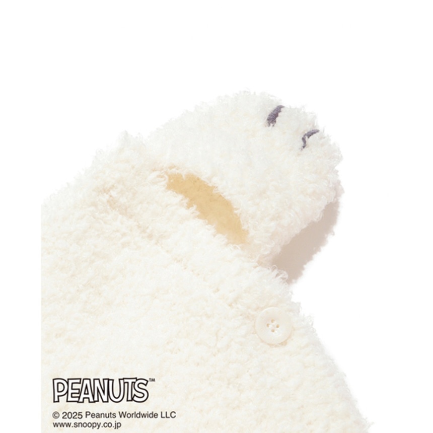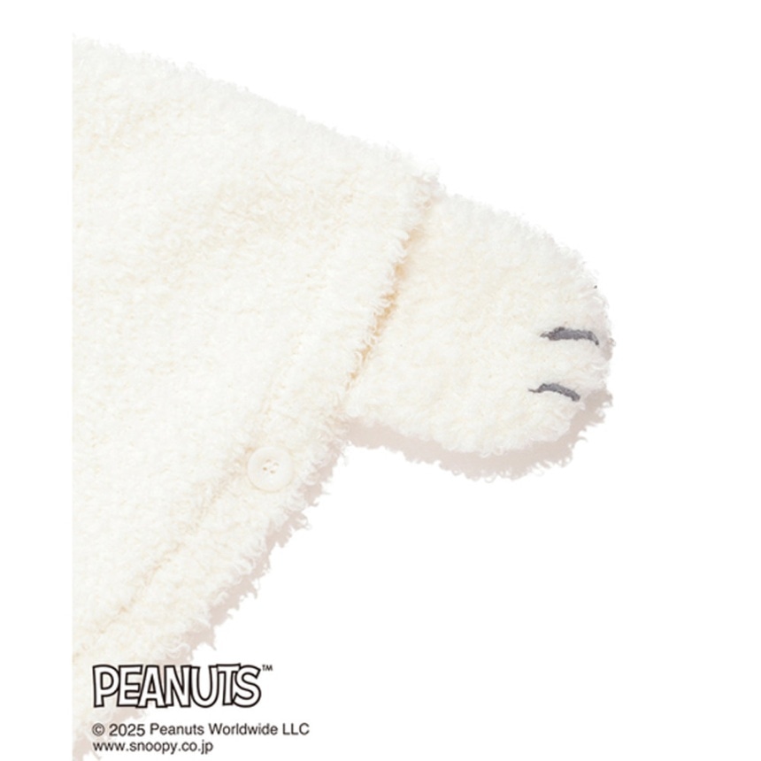 まるでおもちゃ箱から飛び出してきたような、小さくて無邪気な6きょうだい。PEANUTSとgelato piqueのコラボレーションシリーズから、スヌーピーときょうだいたちの子犬時代を描いた『デイジーヒルパピーズ』をモチーフとしたコレクションが生まれました。パピーのようにくるくるっとした糸で編んだ、BABYサイズのふっくらとしたポンチョ。立体的な耳とマズルが付いたフードには、ニコニコ顔のスヌーピーを描いています。袖口は前足をデザインしたミトンが付いており、寒い時にさっと被せてあげることも可能。フロントポケットにはカラフルなロゴ刺しゅうも入れました。背中にはジャガードで表現した模様と、立体的な尻尾付きで、後ろ姿も愛らしく演出します。